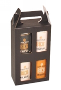 Deze stevige zwarte bierverpakking is perfect om vier blikjes van 33cl stijlvol te presenteren of cadeau te geven. De houder is gemaakt van FSC®-gecertificeerd karton en heeft een handige draaggreep. Door de uitsparingen aan de voorzijde zijn de blikjes goed zichtbaar, wat een luxe uitstraling geeft aan elke cadeauverpakking. Ideaal voor lokale brouwerijen, relatiegeschenken of bierliefhebbers die hun cadeau graag netjes willen verpakken.