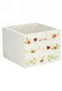Deze houten korf Garden van 11,5 × 11,5 × 10 cm is een perfecte basis voor stijlvolle kadoverpakkingen. De witte korf is aan één zijde bedrukt met een Lieveheersbeestje, bij, vogel en bloemen, wat zorgt voor een frisse en natuurlijke uitstraling.