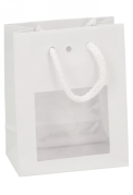 Deze Luxe Witte kadotasjes zijn Mat gelamineerd en gemaakt van 157 grams papier. Aan de voorkant van het tasje is een PVC venster waardoor je het product aan 1 kant kunt zien. -Mat gelamineerd -157 gram. -Kartonnen verstevigingen 450 gram in top en bodem.. -Afmeting 11,4x6,4x16,6cm . -Katoenen koordjes 6mm / 16cm wit. -PVC Venster 7,5x7cm (voorzijde) -Verpakt per 25 stuks , prijs per 25 stuks.