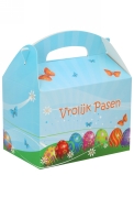 De paasdoos is all-over bedrukt met een leuke paasprint en de tekst Vrolijk Pasen.