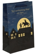 Deze luxe Sinttasjes zijn uitgevoerd in stevig 170 grams papier met een glanzende afwerking en katoen koordjes. Beide zijden hebben een eigen bedrukking: aan de ene kant staat “Sinterklaas is weer in het land!” en aan de andere kant “Vol verwachting klopt ons hart…”. Zo ontstaat er een sfeervol geheel dat perfect past bij het Sinterklaasfeest.